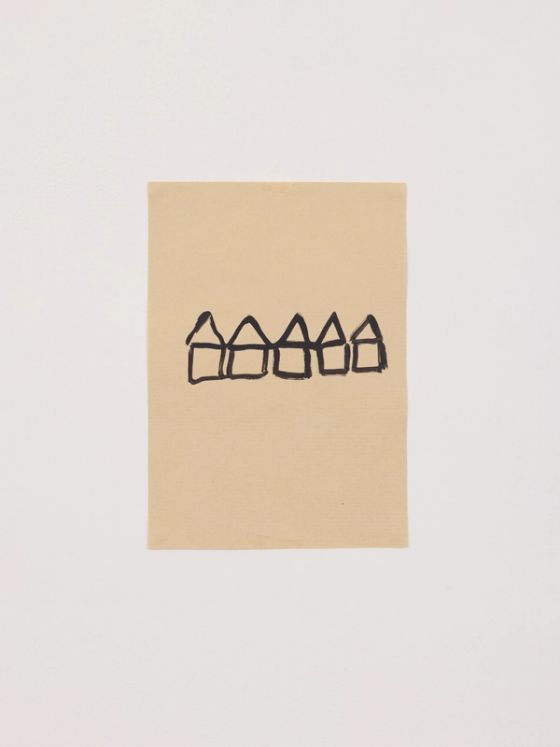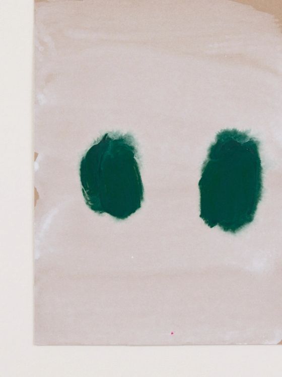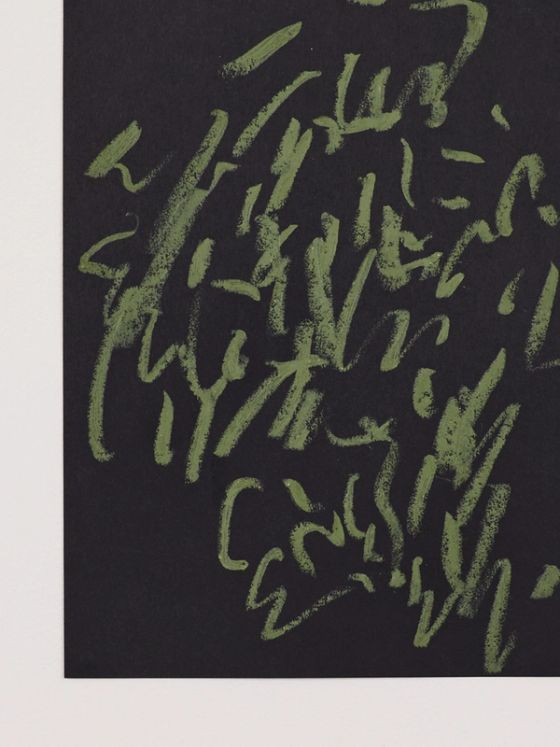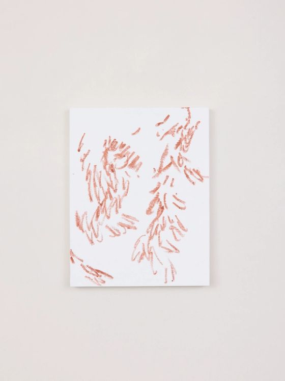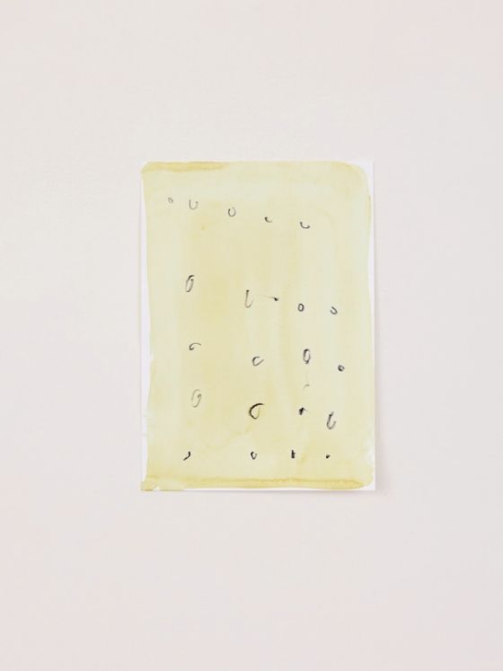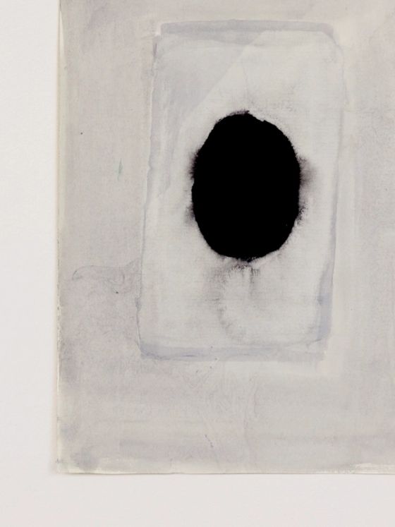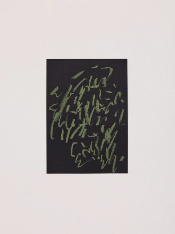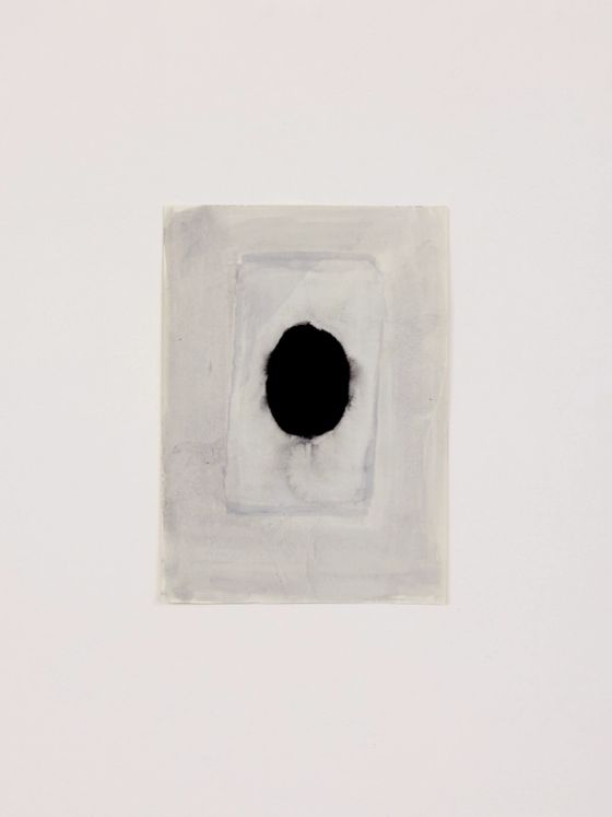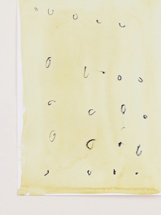 Hodge creates her abstract paintings and drawings with immediacy and intuition, working quickly and performatively to make sweeping, gestural marks. Using acrylic diluted with water on raw, untreated canvas, she often softens the surface with a brush, blurring calligraphic gestures into ethereal forms.