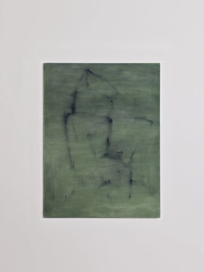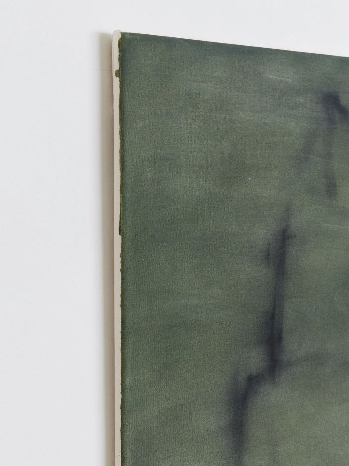 Hodge creates her abstract paintings and drawings with immediacy and intuition, working quickly and performatively to make sweeping, gestural marks. Using acrylic diluted with water on raw, untreated canvas, she often softens the surface with a brush, blurring calligraphic gestures into ethereal forms.
