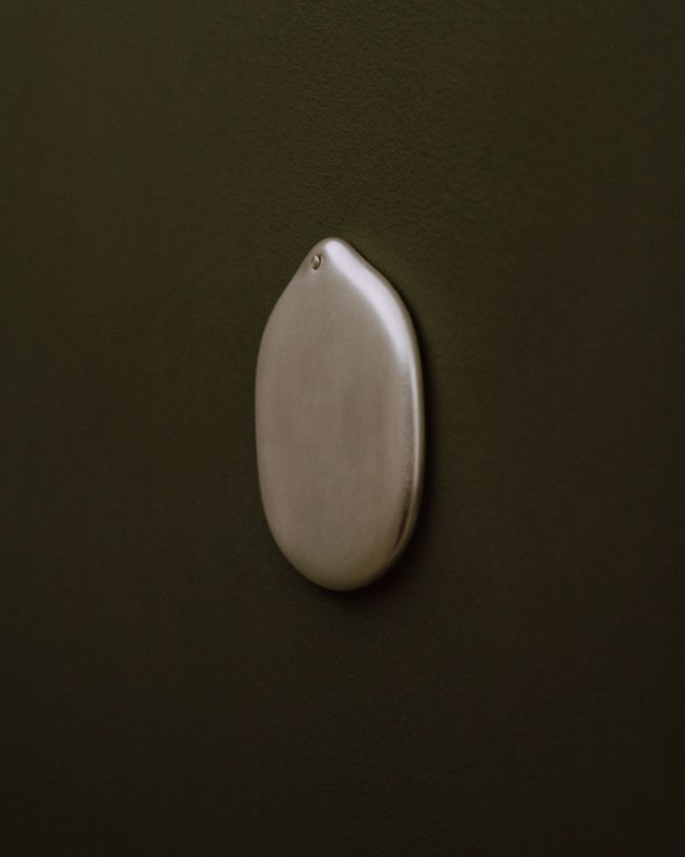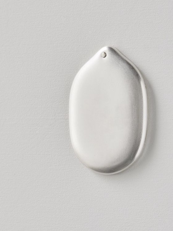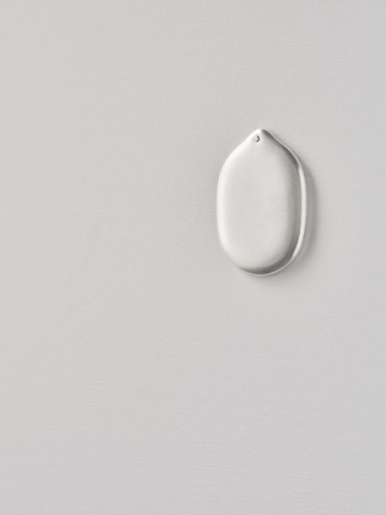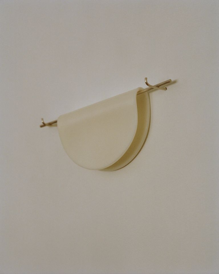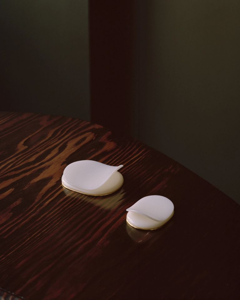 An ovoid vessel with a thick, grounding base and tracing-paper sides reacts to the light, transforming under different conditions to reveal or conceal the gold piece that sits, pleasingly, at its centre. In another piece, two palm-sized ovals – one in glass, one in gold – interact: layered one atop the other, the glass has started to lift, curling up on both sides, peeling away from the flatness of the metal beneath. The curvature of the glass creates a compelling composition, an on-going conversation between the two materials, where the transparent wisp imposes itself upon the golden base, throwing shadows and drawing curved lines onto its shimmering surface.