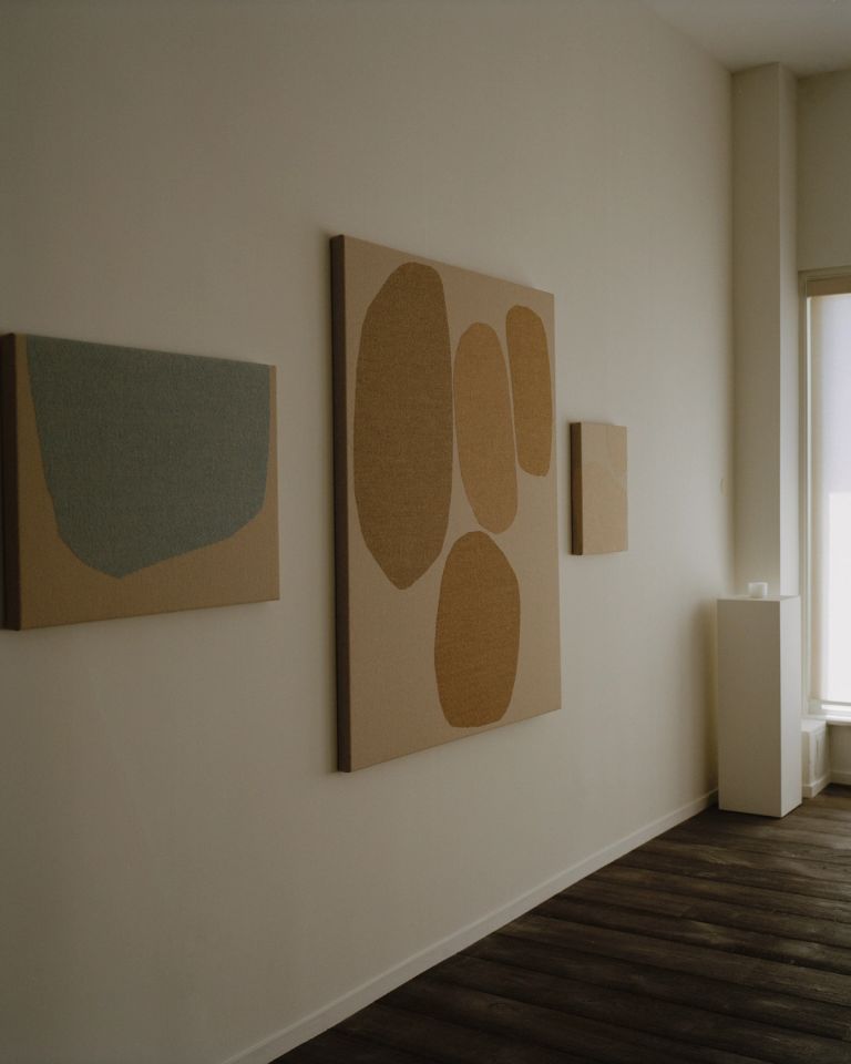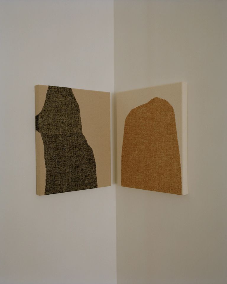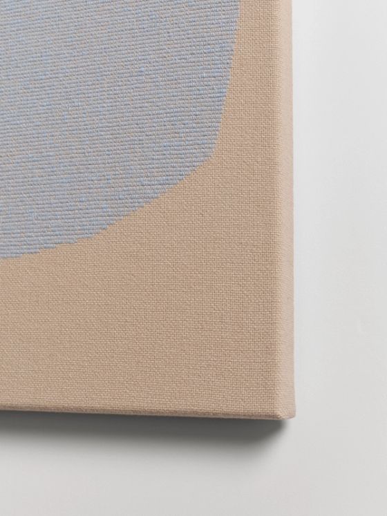 With a faint outline on the coarse wool upholstery fabric, Halstrøm begins to embroider; starting, at one end or the other, creating small vertical stitches of the same length, in a single colour, evenly spaced across the surface. When presented in contrasting tones, blue on beige or pink on ecru, the forms and shapes come to the foreground – be it a rock or pebble; a crevice or crack; a formation of clouds or a murmuration of birds – but when working tone-on-tone, the embroidered patches act more as a relief, a faint yet exquisite play of light.