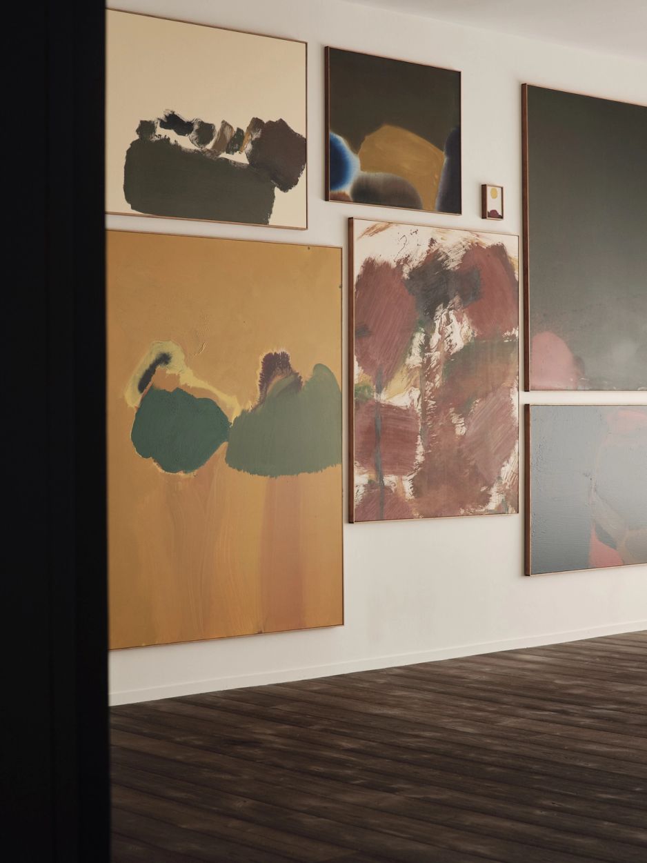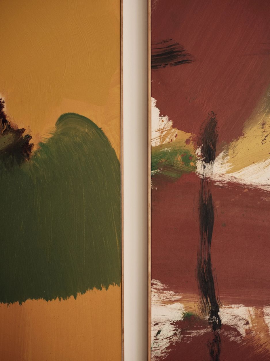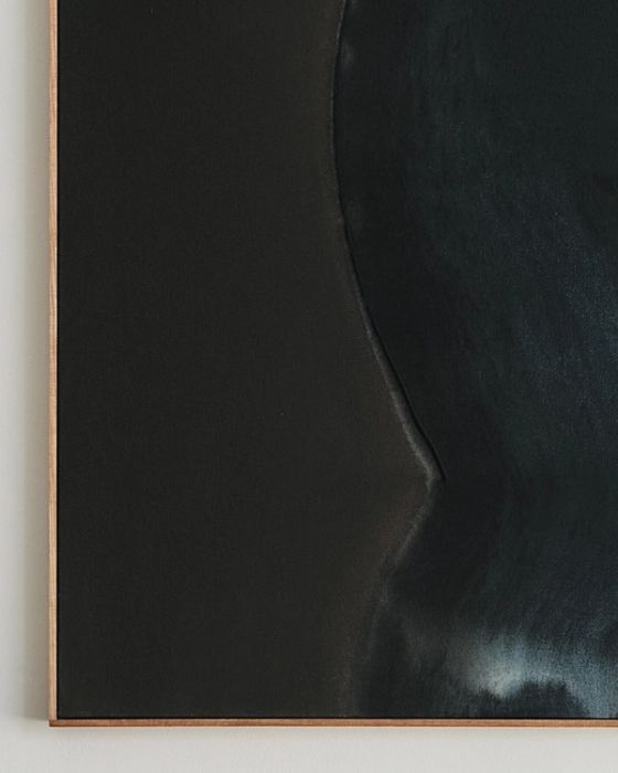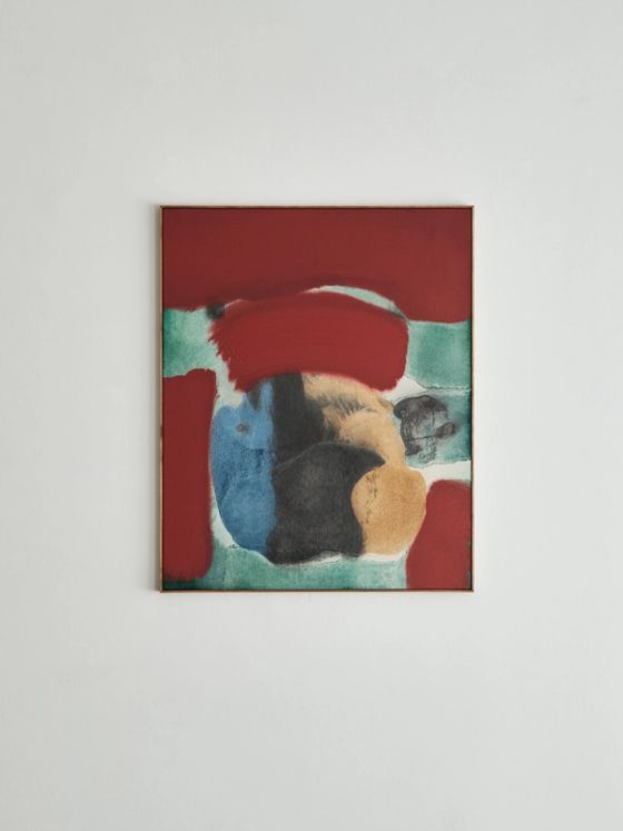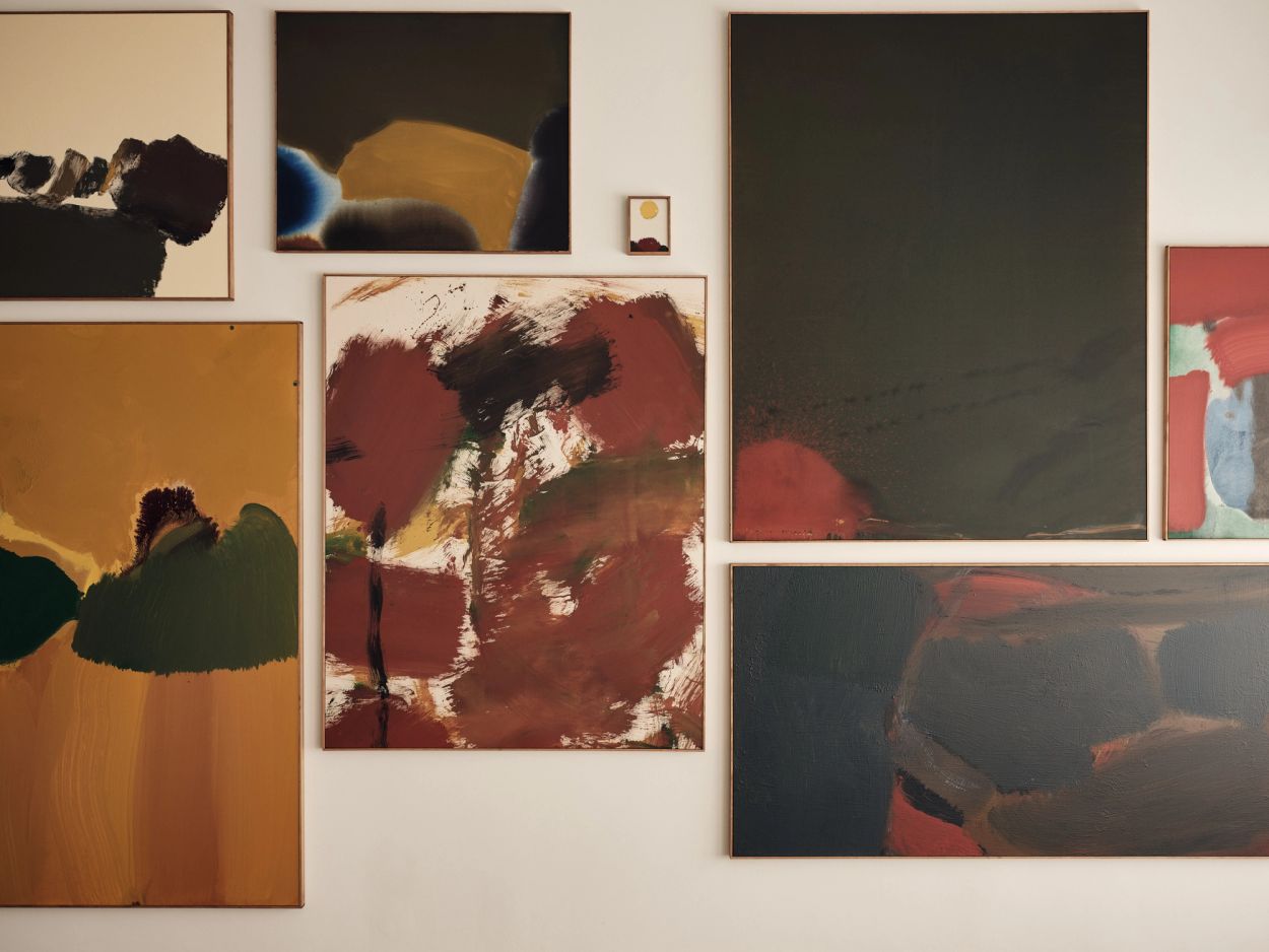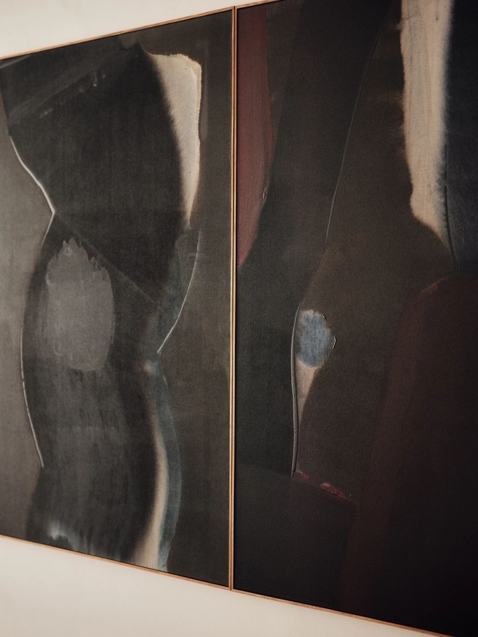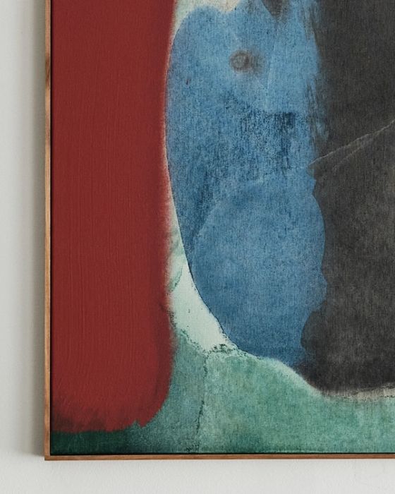 Making use of a limited palette of saturated yellow and brown ochre, contrasted against deep blues, greens and burgundy, the compositions are often graphic, and activated by fragmented shapes, textures and negative space. Some colours are kept in separate blocks with the precision of a screen print, while others bleed at the edges, overlapping and coalescing.