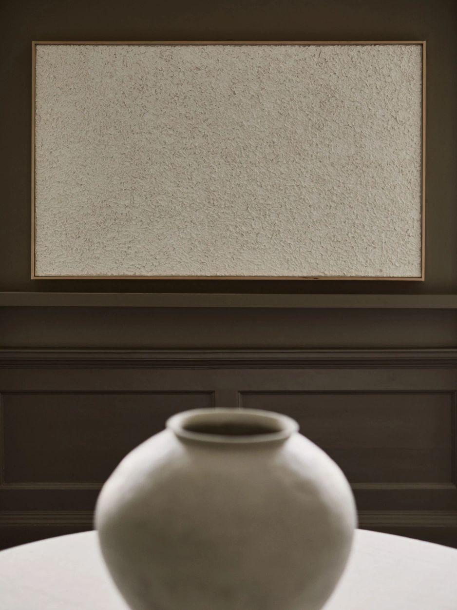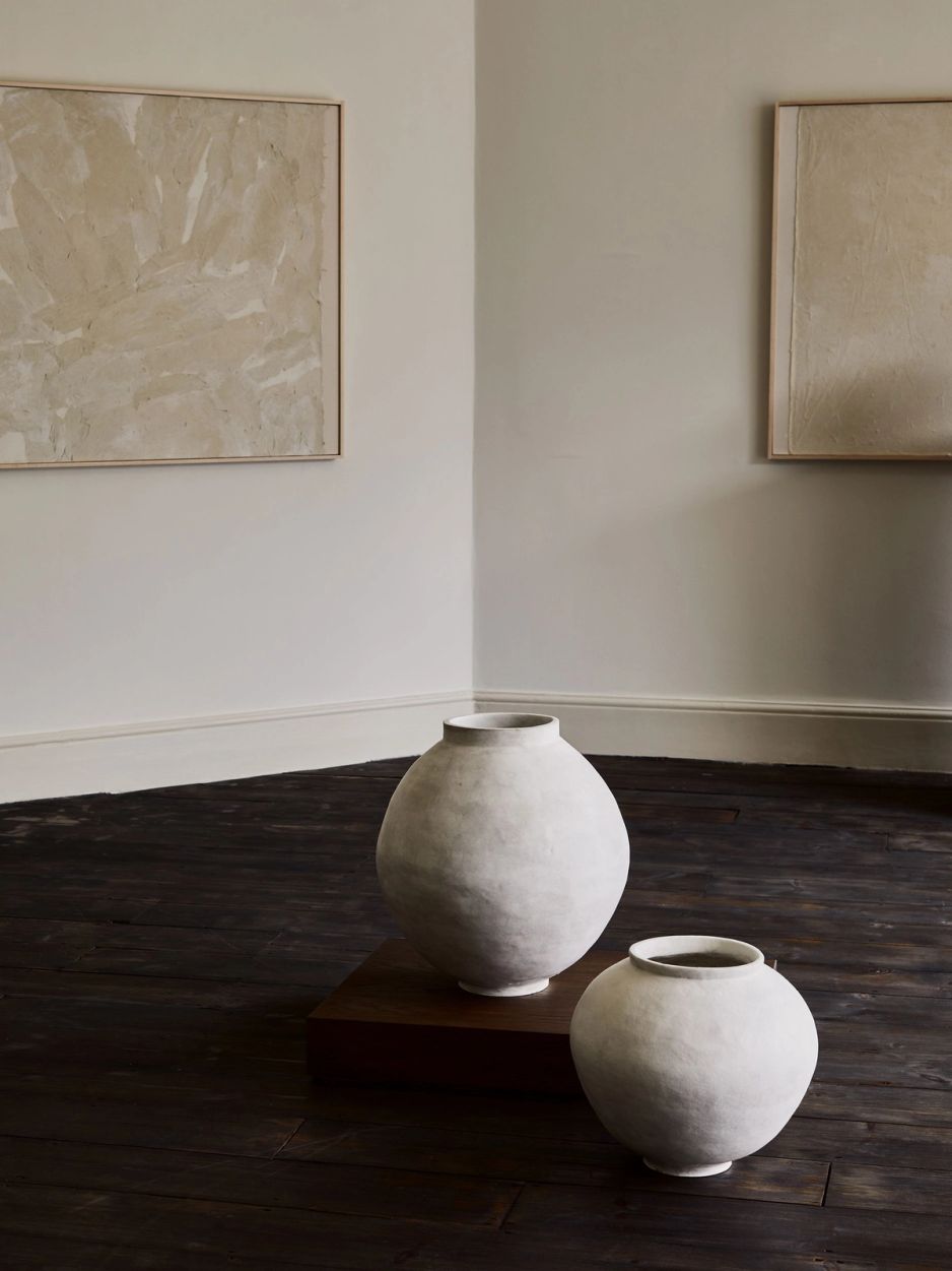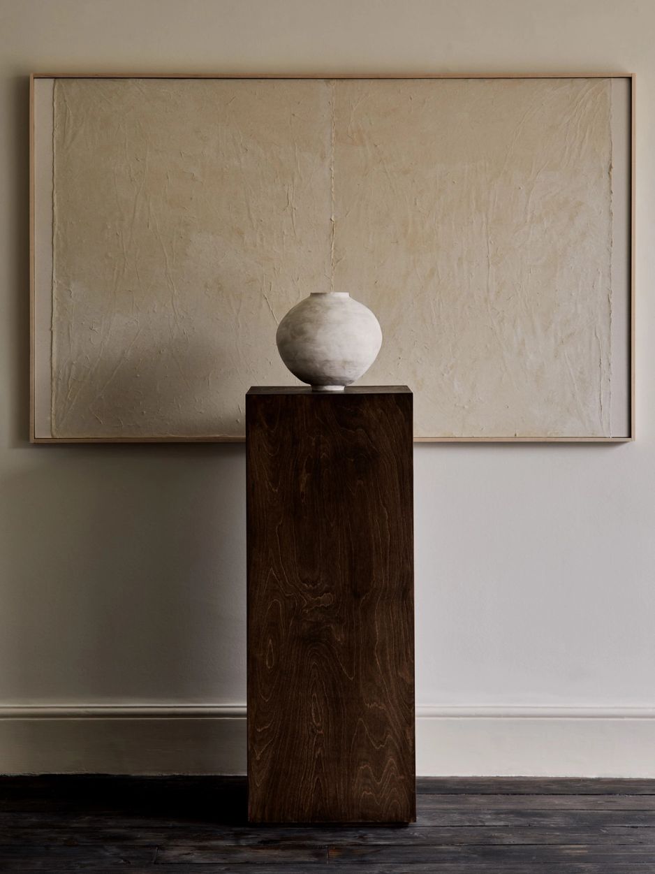 Rounded, raw clay vessels on high plinths occupy the imposing ground floor windows of a Georgian townhouse. On another aspect, a solitary moon vase rests on a low pedestal, beside a shard of lichen-mottled bark: Francis Gallery is currently hosting its inaugural show, Modern Archive, at its new, permanent location at 3 Fountain Buildings, Bath. With a respectful attitude towards the Georgian site, gallery director Rosa Park and designer Fred Rigby has collaborated on an extensive renovation of the space. Ornamental cornicing and dados have been restored, and the floor has been stripped back to its original boards. Inspired by Korean aesthetics, with a nod to Bath’s quintessentially English heritage, the gallery’s collection is interspersed with both Korean and English antiques. Natural objects from the surrounding Somerset countryside – magnolia cones, piles of jade green moss, and sculptural bark – also accompany the artworks, providing further context.