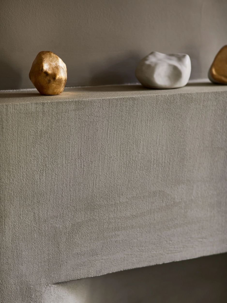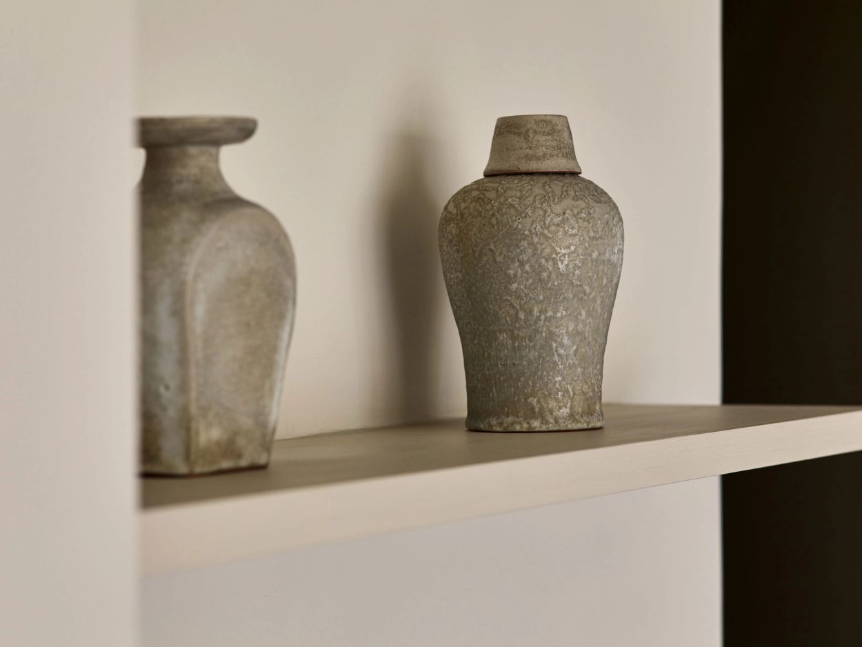 The Archive stoneware vessels in the show are a continuation of Hur’s series from 2019. These additions have a mottled, matte green glaze with an inconsistent, cloudy finish, achieved using a gas-fired kiln, which applies heat unevenly to the jar. “The gas-fired kiln introduces an unpredictable element, which is the aspect of ceramics that fascinates me – I love the parts of the process that are outside my control,” says Hur. The forms are inspired by historic ceramics from the Goryeo period (918-1392 CE), including vessels with a separate stoneware lid. Underneath, the lip of the jar is finished with golden leaf. “These pieces were traditionally given as gifts during ceremonies,” says Hur. “They contained honey or alcohol, which were the most precious commodities at the time. Many of the historic examples on display at museums do not have the stoneware lid – they have been overlooked, lost or destroyed over the years. I think it adds such an interesting element in combination with the golden leaf: you lift the lid and the gold is revealed. It is very subtle.”