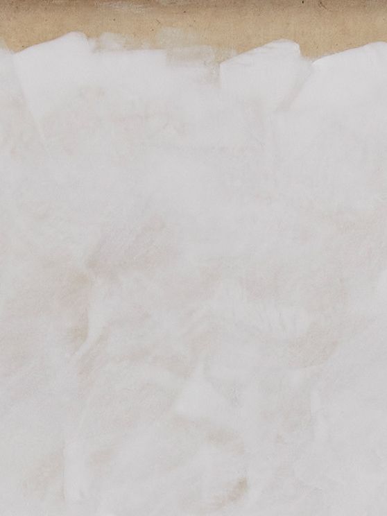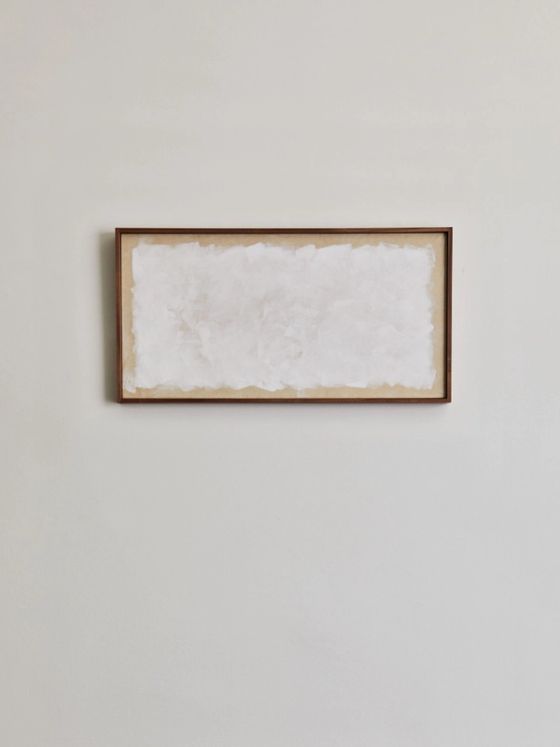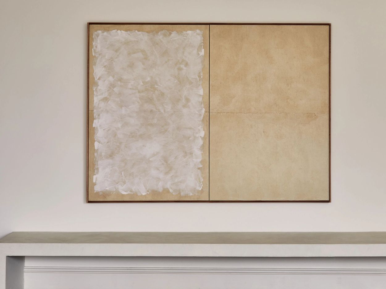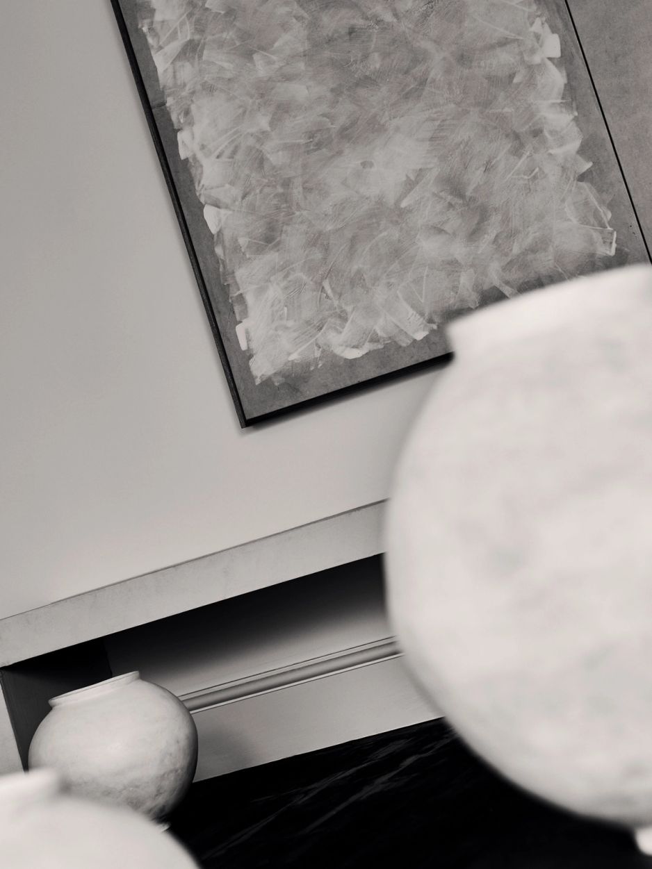 Expanding her ceramic practice to incorporate hanji was a natural step for Hur: the material has a malleable quality similar to clay, and holds an important place in Korean heritage. The works range from canvases with a surface of stoneware-like coarseness to those with a multitude of ridges, waves and peaks. Here, the fibres of the paper are scraped up with a brush, forming gestural, painterly brush strokes in subtle relief. The paper, made from the inner bark of the mulberry tree, loosens its fibres when mixed with water; once altered, it is set with gesso and glue. “Hanji has this tactile quality that is very sculptural,” says Hur. “There is also an emptiness in the works. In Korean heritage, the void is considered a generative space, one that speaks to something beyond the artwork itself. I think the sense of ensemble the hanji pieces create with the other works is very important. No one piece is the defining statement; rather, they collectively create a space in which the environment around them becomes the main focus.”