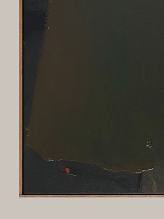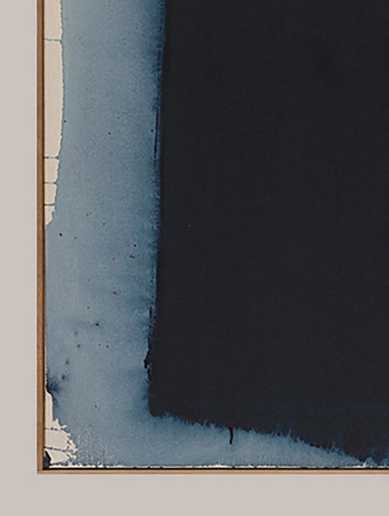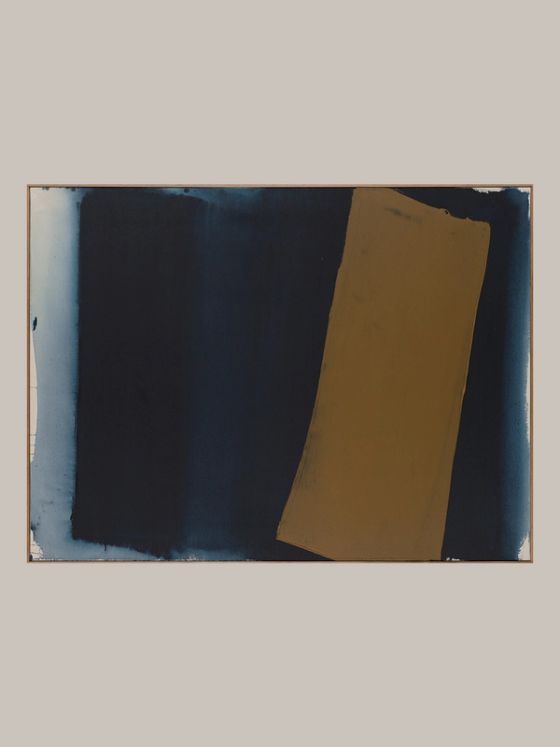 A focussed, minimal approach is evident in this collection of Besançon’s work. From a diverse and experimental practice, he has come to limit his compositions to four formats, using no more than two to three colours for each work, often contrasting one darker and one lighter shade. The palette of the series is defined by a fascination with navy blue, as well as shades of golden ochre and forest green, which, especially against the beige linen canvasses, imbue the kinetic brush strokes with a brooding, autumnal tone.
