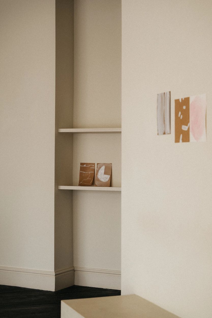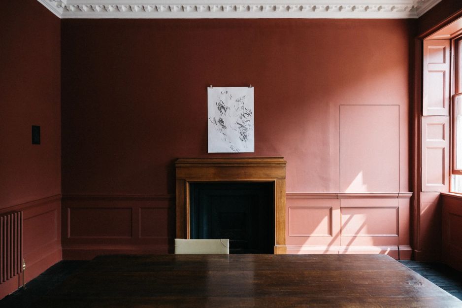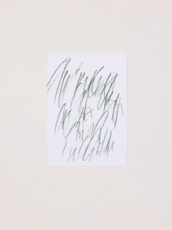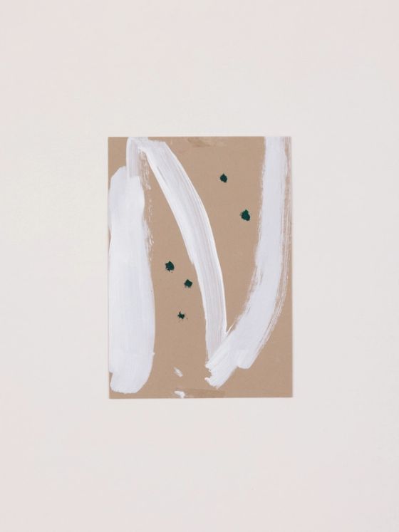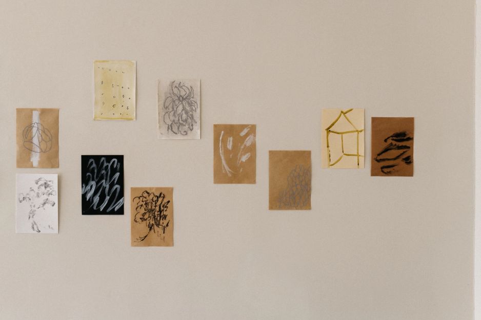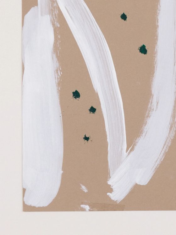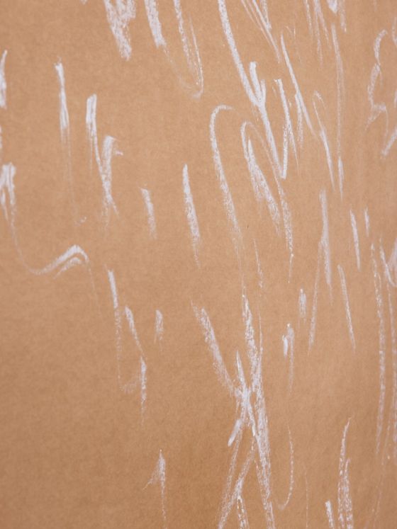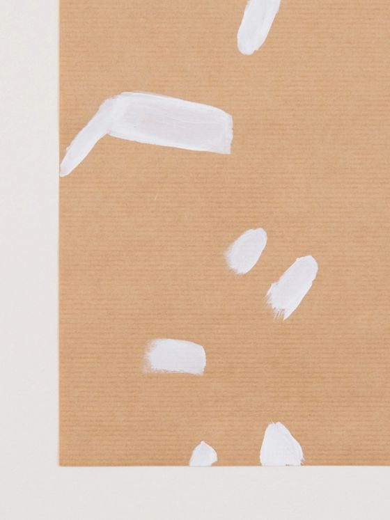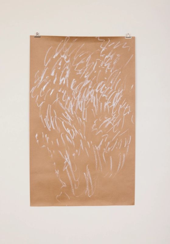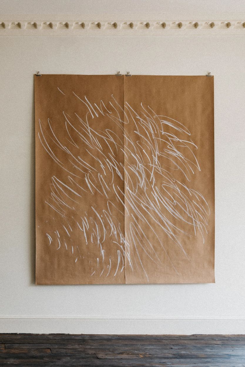 The drawings for Touch paper have, over time, explored multiple directions. One hallmark of my practice is that I don’t ever revisit the same thing twice; rather, my work makes forays into the unknown. Initially, I made a series of 60 or so A5 drawings that had size as their common denominator, but which quickly developed a sense of playfulness as elemental shapes such as circles, triangles and schematic lines began to emerge. After this, I tried to turn off all conscious thought to allow myself to work intuitively with purely abstract drawings. I often worked in series, sometimes using large sections of brown card as well as smaller pieces of paper, grabbing whatever media was immediately to hand in the studio. I would start each drawing with a mark and then work quickly across the surface – putting mark next to mark – often not quite daring to look, and simply allowing my hand to guide itself.
