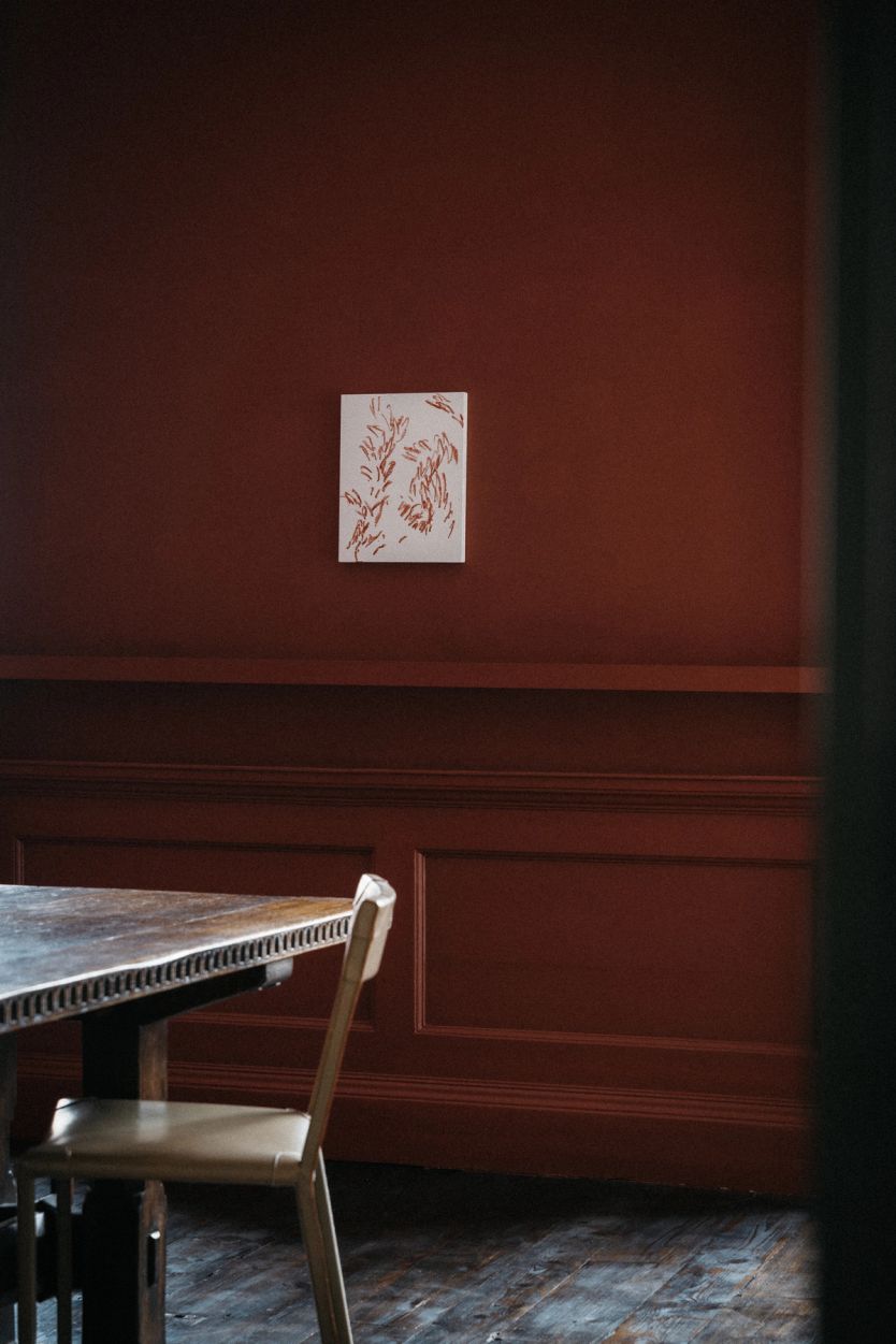 Indigo voyager, you lift above green, travel in horizontal time, with silent messages. Deep green grows behind you, smudged over a paler green. The gaps between are soothing, not anxious, as ideas seem to float past. Emissary (2025), like many of Nicky Hodges’ paintings is quiet, but it is not easy. It has activity within the quietude; a thinking mind behind a calm face. And don’t we seek both – the beauty and tranquillity of abstraction that frees us from the tyranny of representation, and yet also the sense that something is yearning to be represented at the edge of the image – or no – from within it.