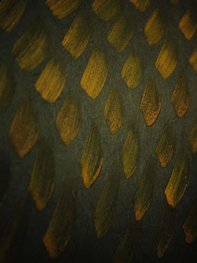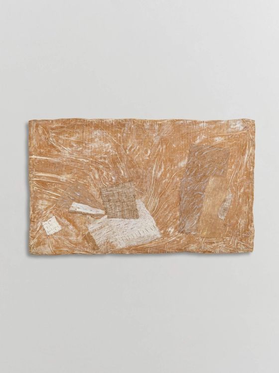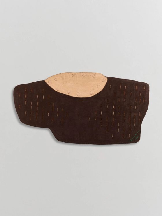Thick chunks of material – composed in layers of cardboard, linoleum, linen and hanji - are presented as an integral object, a single piece. Created in pursuit of the autonomy of the surface, these freeform structures offer the artist a substantial interplay between the surface and the subject. Painted a deep brown, these shaped ‘canvases’ are host to small flecks of colour and grainy brushstrokes, a collage of textures and techniques.