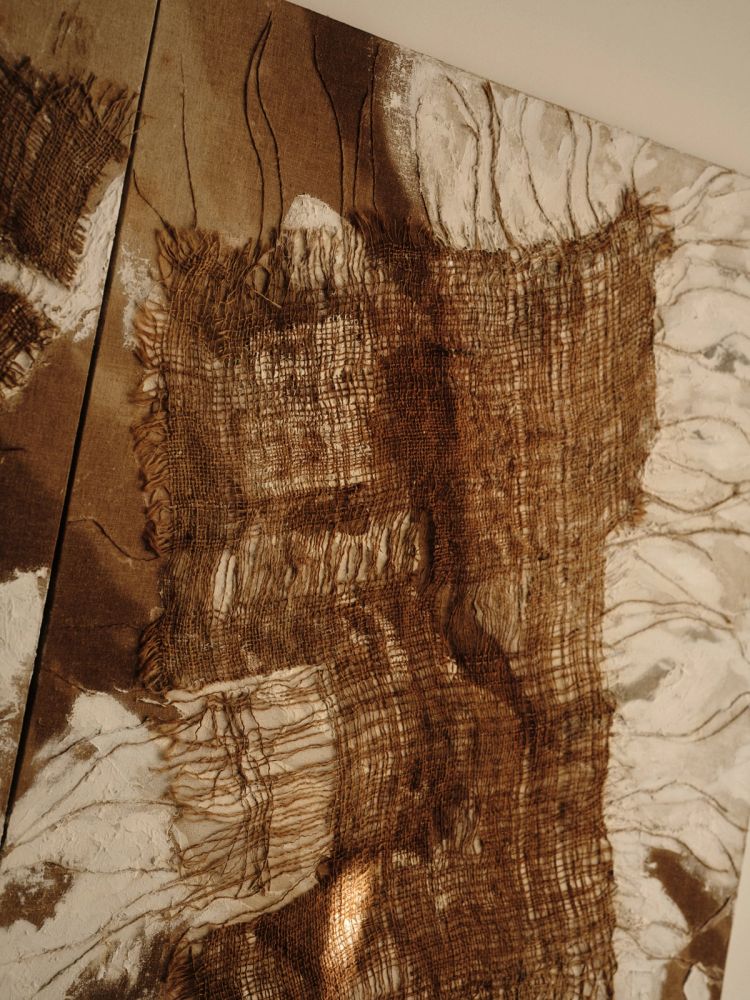 Raw hemp and cotton, burlap and twine – the coarseness of her chosen materials reveals the details of their construction, their warp and weft laid bare so that the artist might capture something of the delight and horror of pulling at a loose thread…