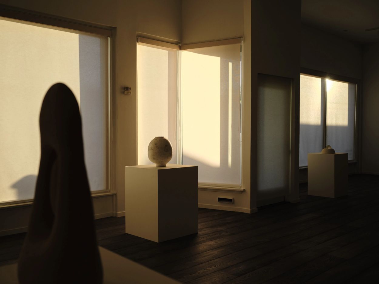 A series of carved clay spirals with cragged edges and coarse surfaces resonate at a deeper level beyond words. Like fossils, these objects feel as if they were unearthed from another time, their meaning and intended use unbeknownst to us. Ceramic tiles coated in a thin, milky glaze are presented in diptychs and triptychs; explorations of heat and material, these fragments wholeheartedly avoid representation and remain resolutely ambiguous.