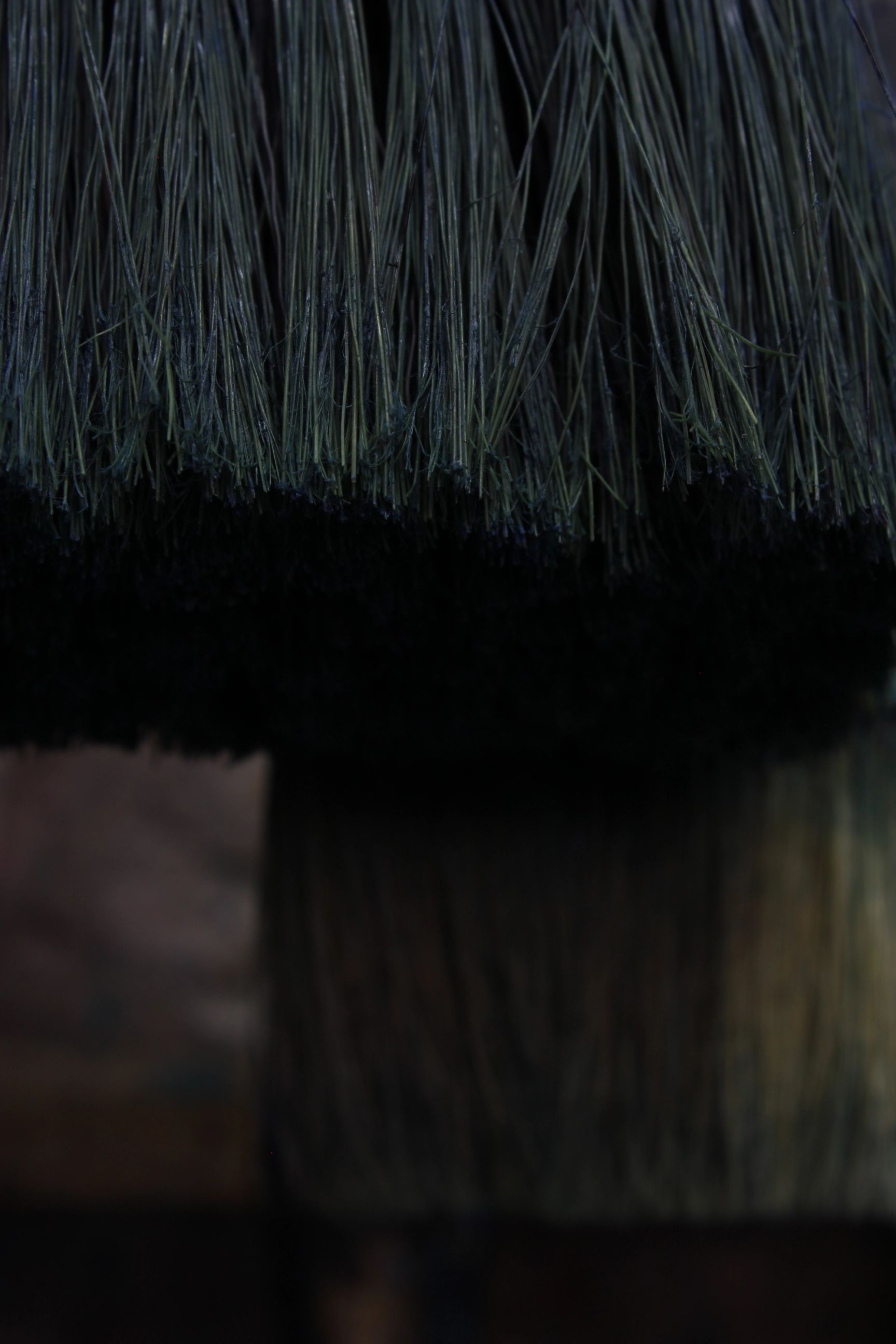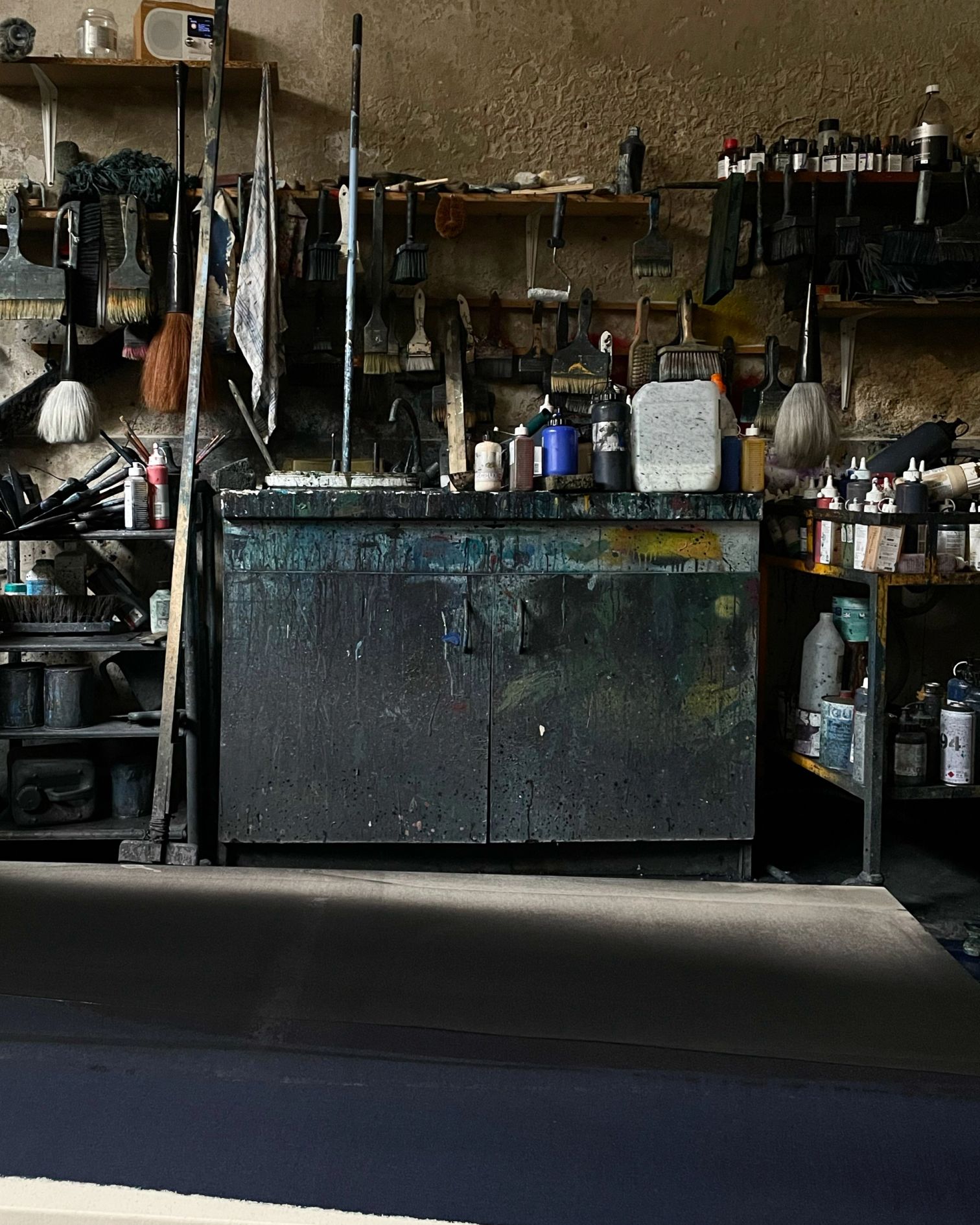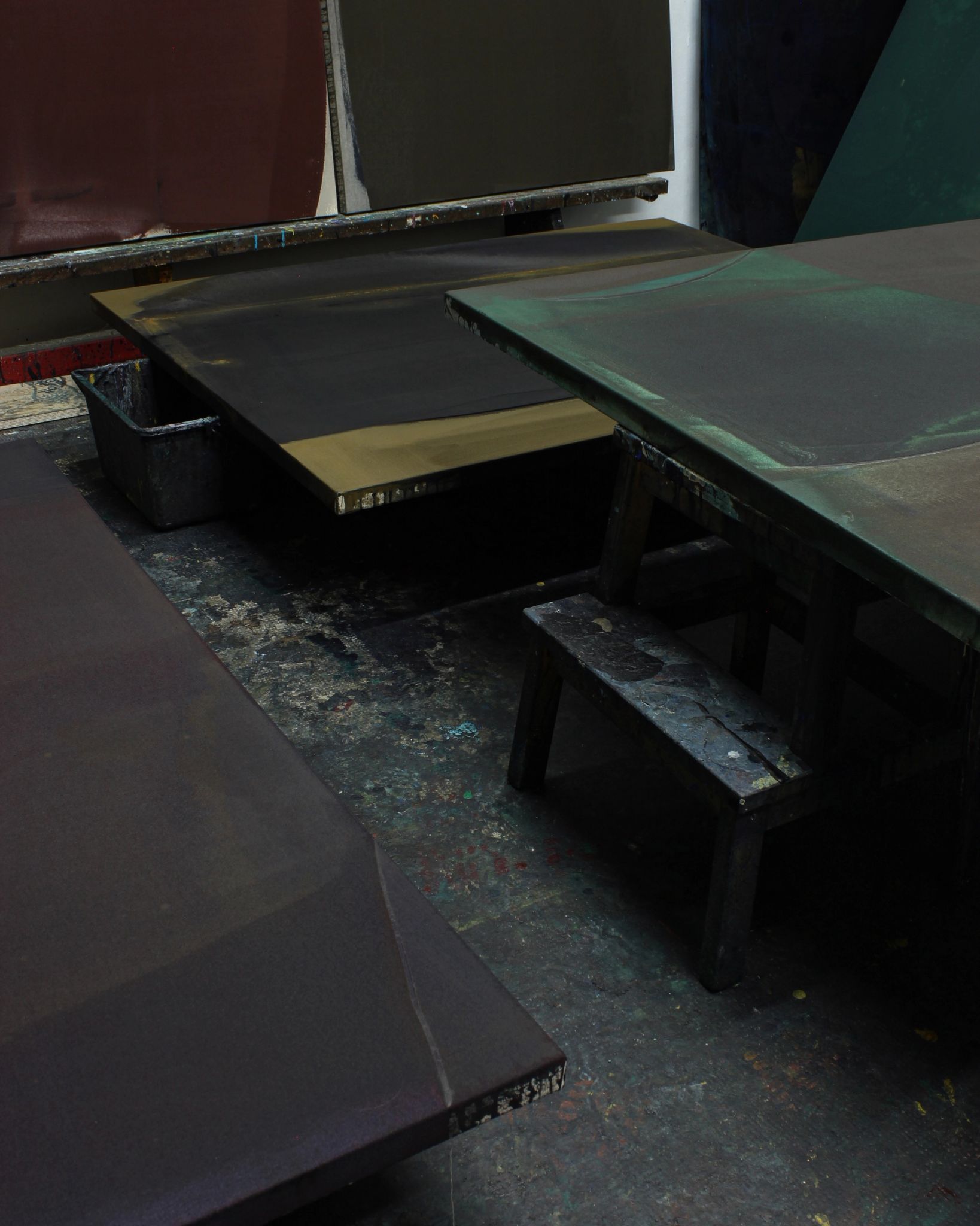 In his studio, Besançon works simultaneously on several canvases, laid horizontally and slightly raised from the ground. He moves between them, tracing, flattening, brushing and orienting the paint in either large flat areas or more concentrated strokes, without erasing the traces left by his tools. His palette primarily comprises black, Payne grey, Prussian blue, English red, certain greens, sienna and ochre, blended directly on the canvas. The ecru and woven threads of the scraped cotton are also often visible and integrated into the work. Water is a central element in his creative process: in the manner of a water colourist, he soaks the surface of the canvas, thus triggering chromatic changes.