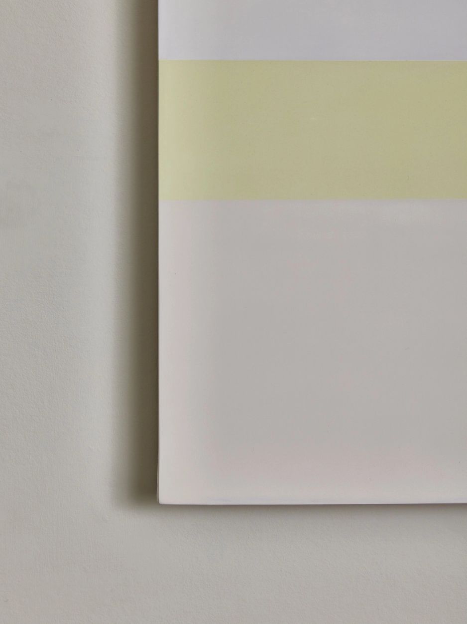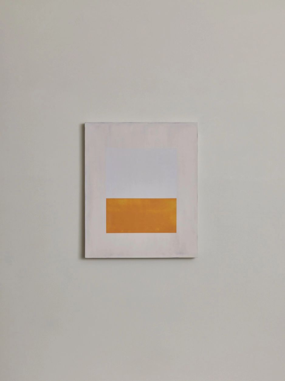 Much of her work incorporates fine-tuned geometry, with soft straight lines dividing fields of colour, and rectangular forms contrasting with one another, sometimes with only the faintest of difference in tone. Her palette is inspired by moments in everyday life, such as the ever-changing sky, beams of light entering her studio windows, or Goryeo and Joseon dynasty celadon vases viewed in a museum.