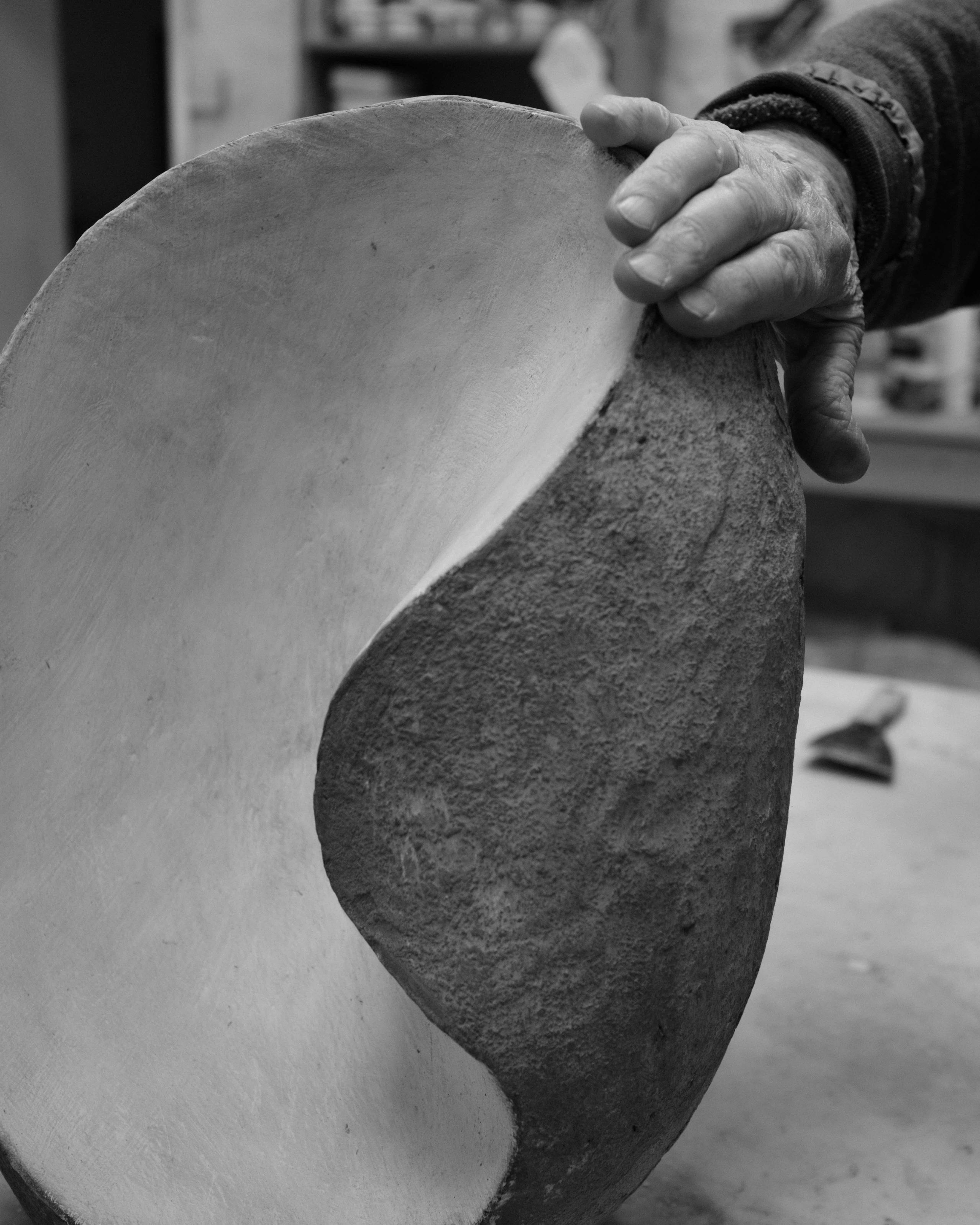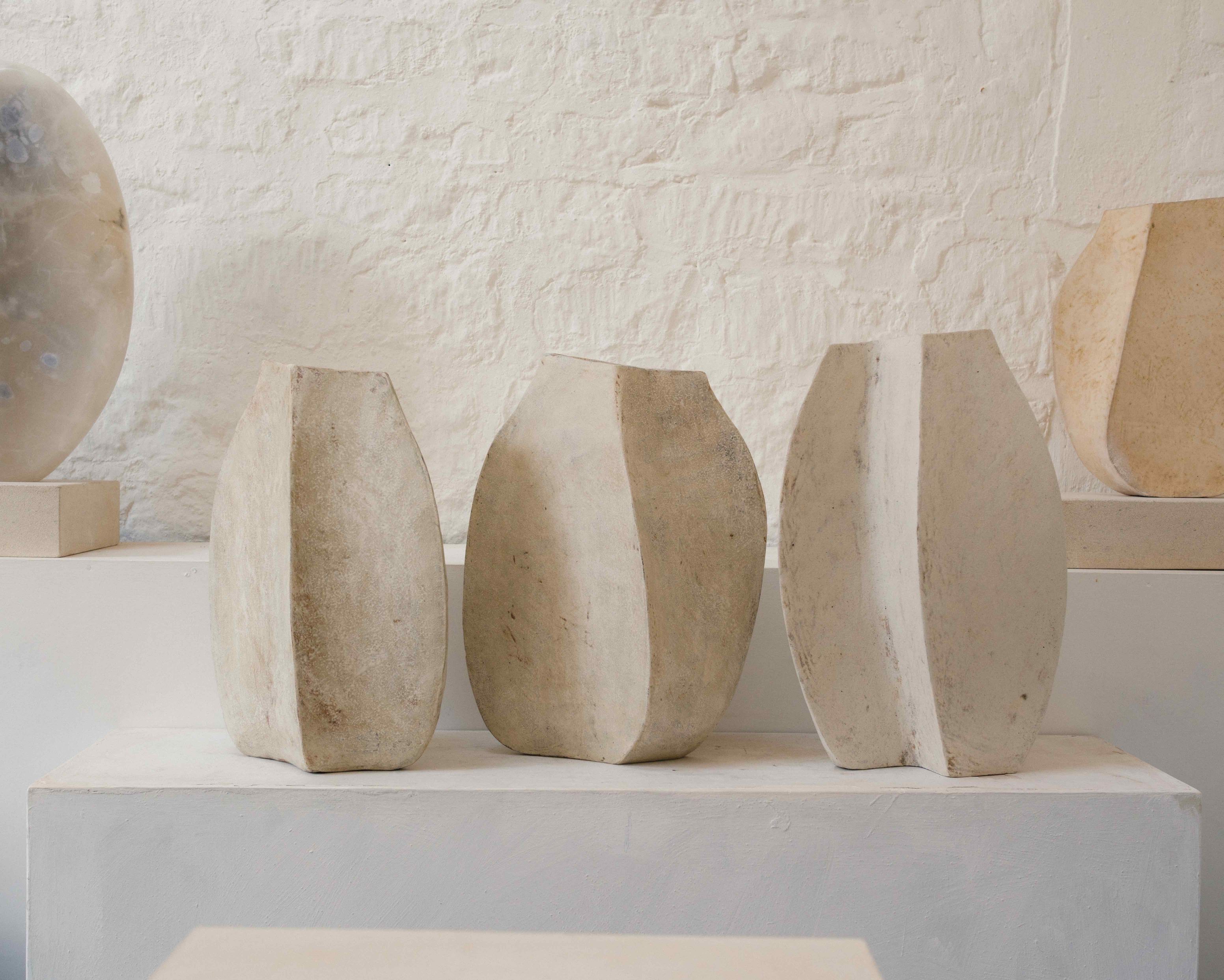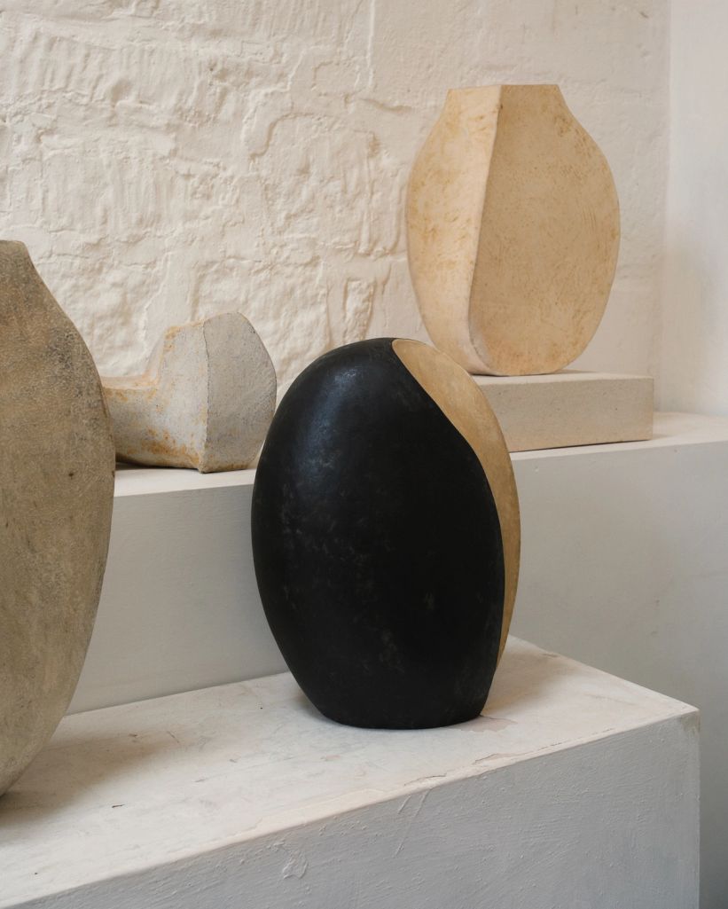 Philp’s work is the product of a methodical, disciplined process: each piece might involve four or five high-temperature firings, whereby thin layers of black clay and iron oxide, liquid white China clay, wood ash, or other glazes are applied in stages to the surface of the ceramic, creating a uniquely rich, textural patina, as if the piece has eroded organically over time. By using a mixture of clays with different shrinkage rates to build each pot, Philp encourages subtle craters and imperfections to arise during the firing, recalling the natural weathering of stone.