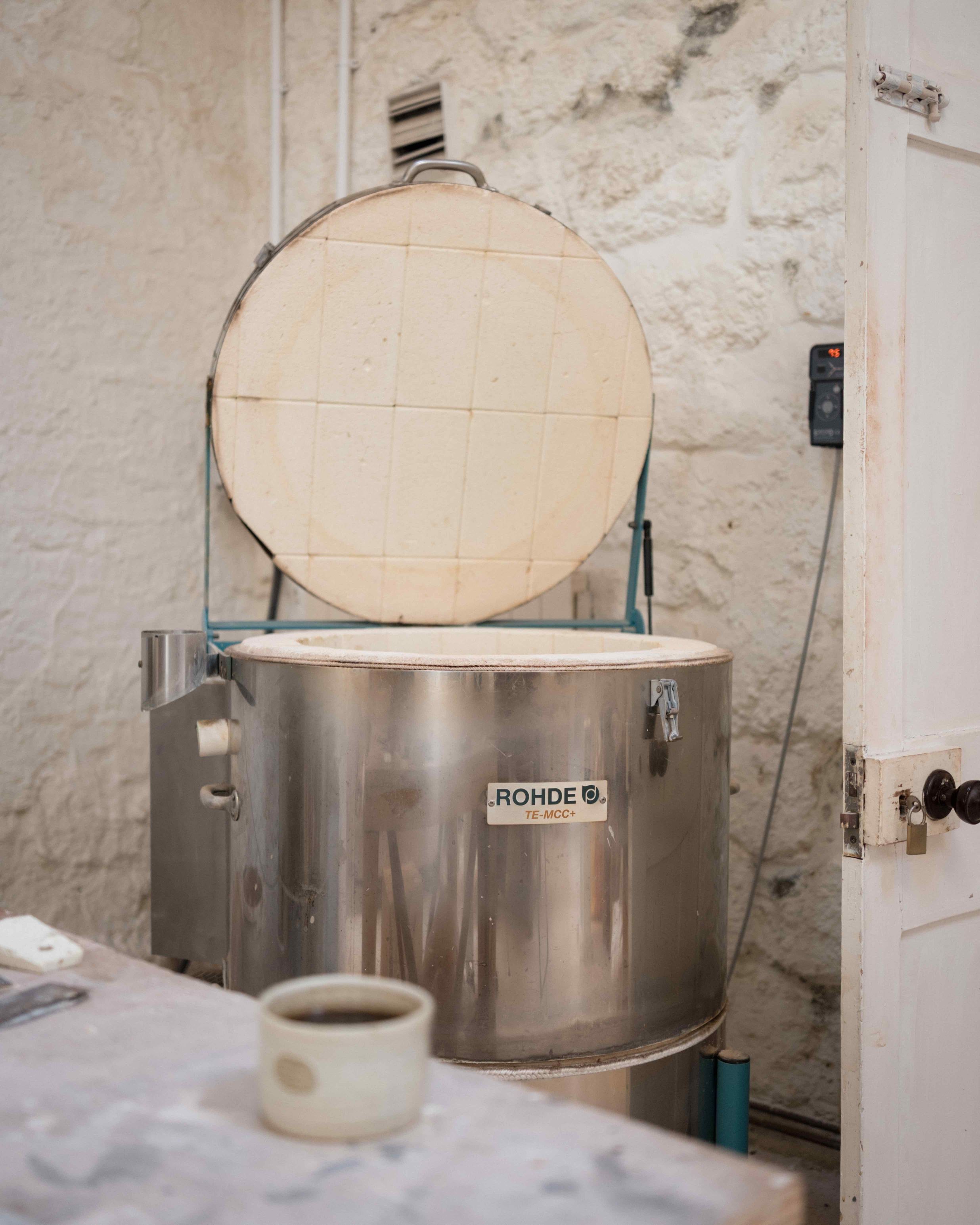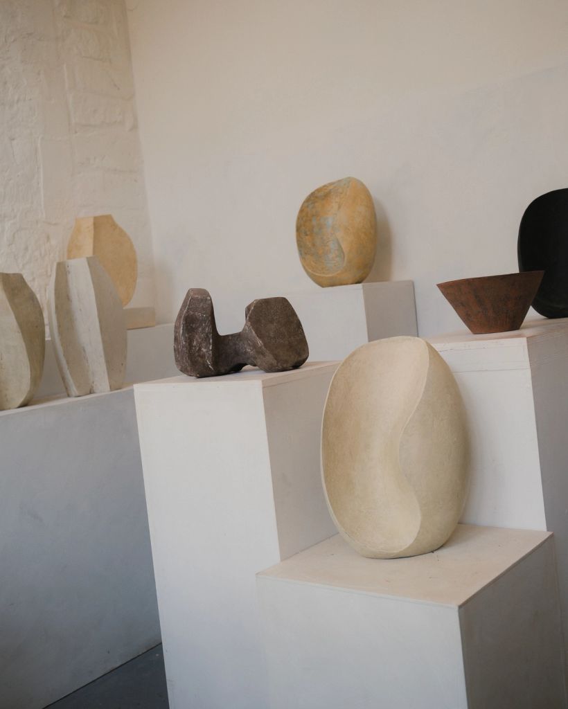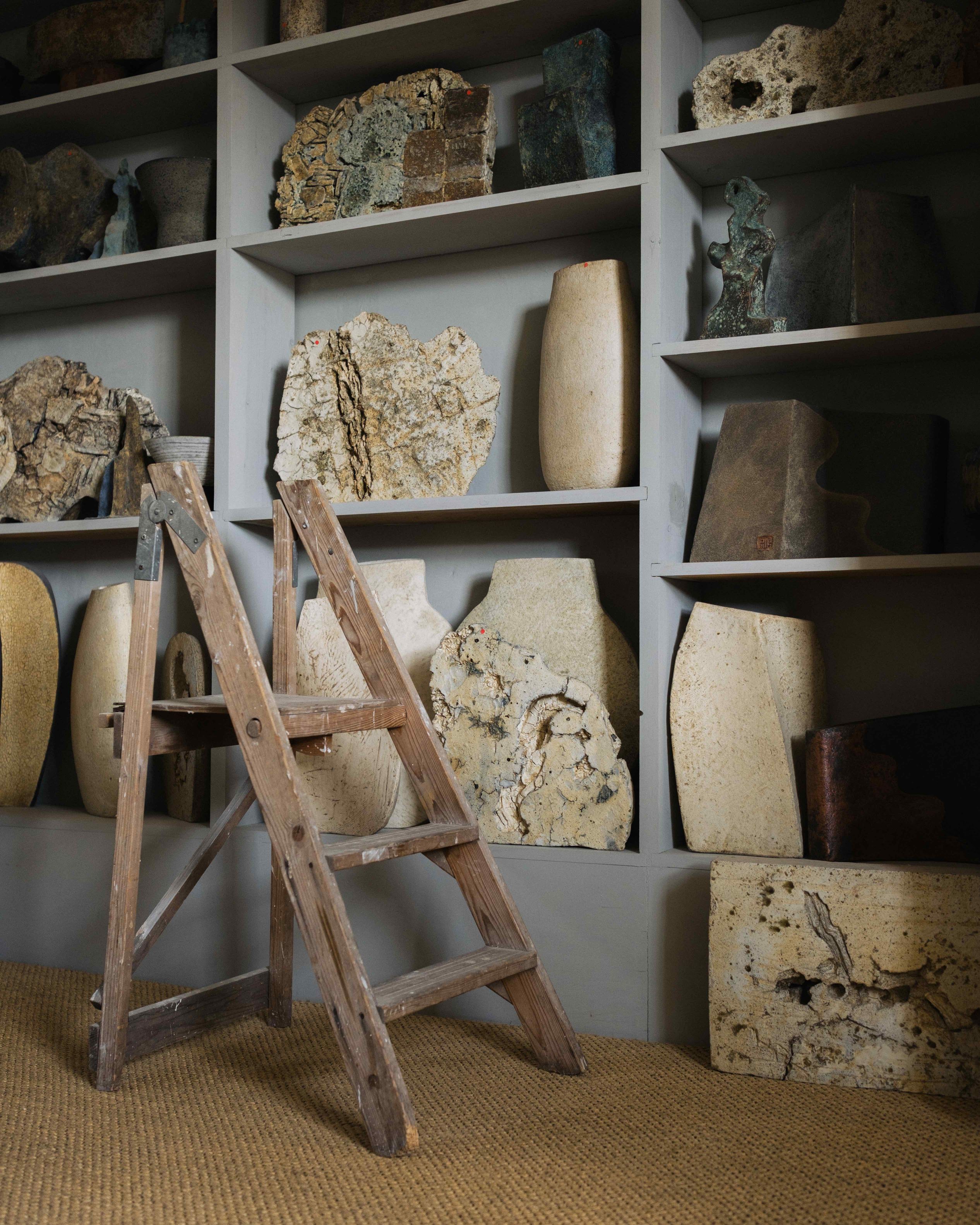 Philp’s work is the product of a methodical, disciplined process: each piece might involve four or five high-temperature firings, whereby thin layers of black clay and iron oxide, liquid white China clay, wood ash, or other glazes are applied in stages to the surface of the ceramic, creating a uniquely rich, textural patina, as if the piece has eroded organically over time. By using a mixture of clays with different shrinkage rates to build each pot, Philp encourages subtle craters and imperfections to arise during the firing, recalling the natural weathering of stone.