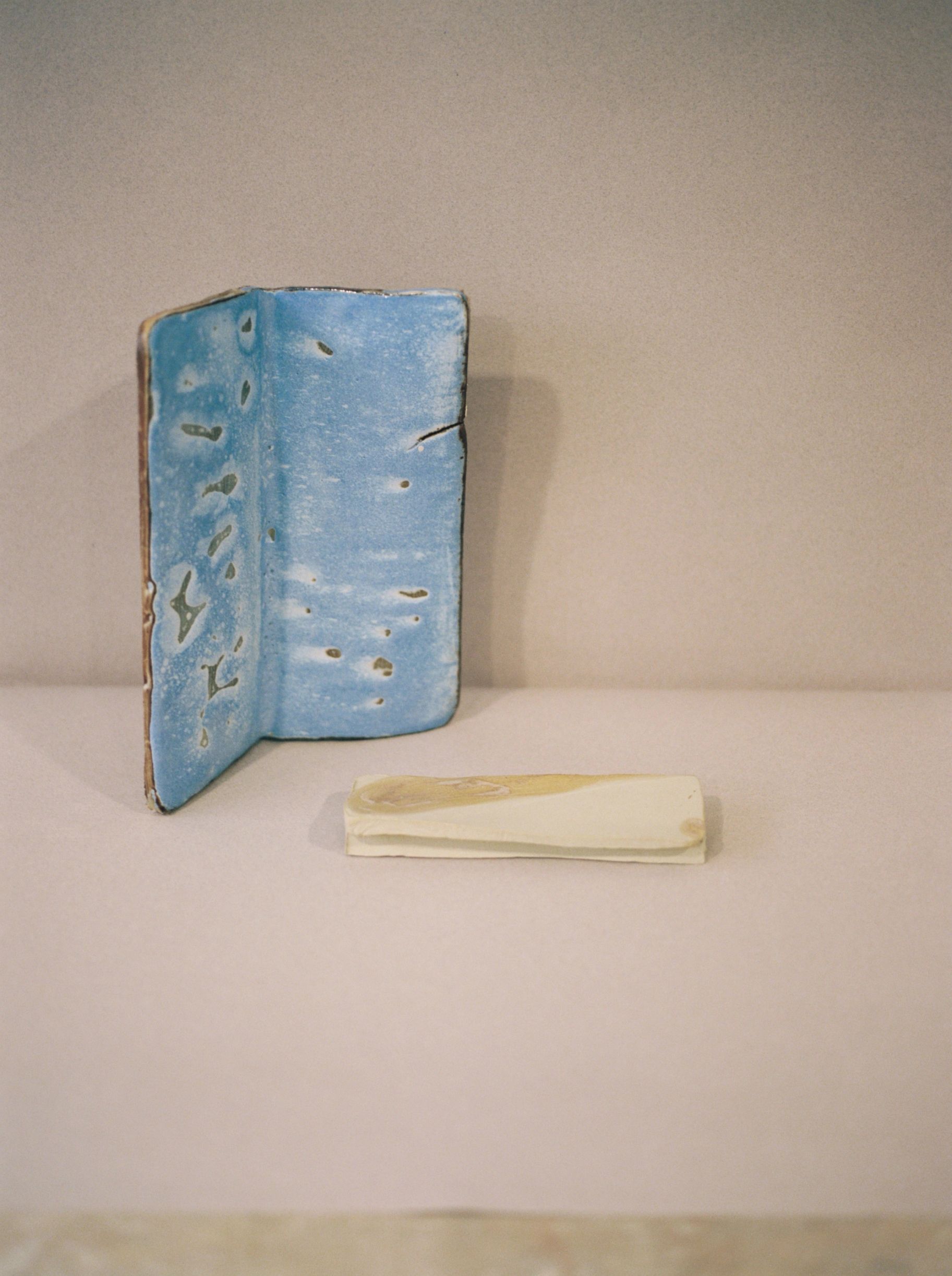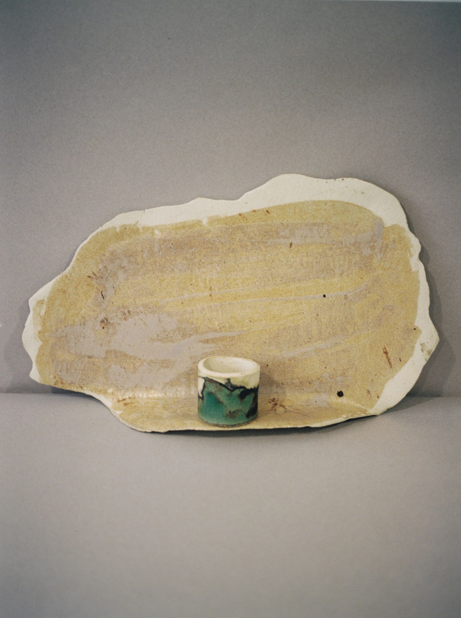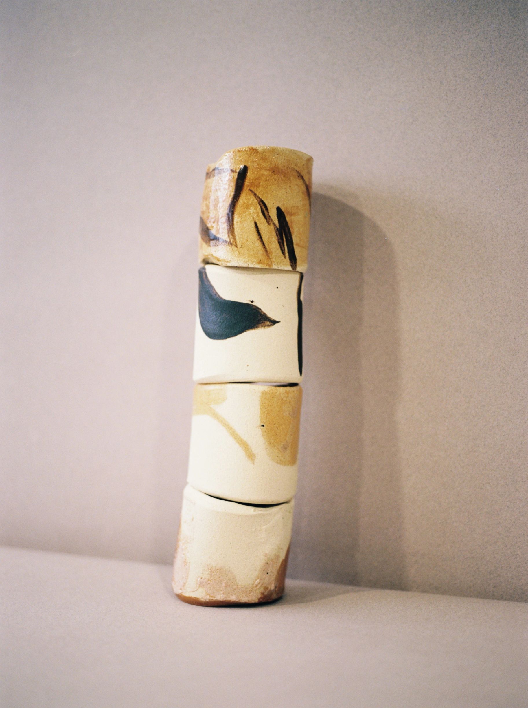 Rosemarie Auberson has collaborated with ceramic artist Juliette Teste to produce a collection of ceramic pieces titled Passe Avant Minuit, exhibited at 0fr Gallery, Paris in November 2019. Adopting a mindset of open experimentation, free from any imposed direction or meaning, the partnership resulted in a playful process of creation, with Auberson painting on the ceramic forms created by Teste.
